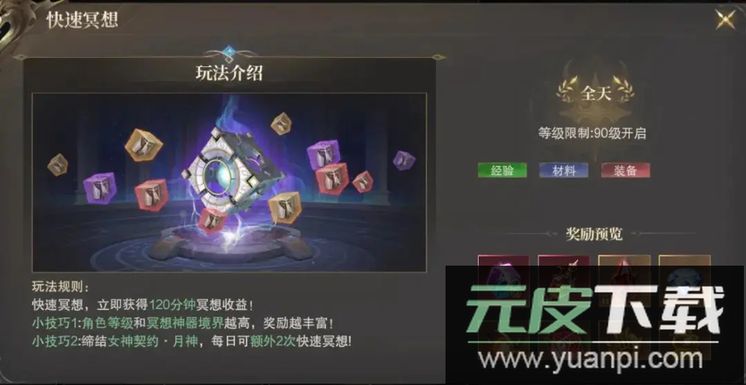 利用快速冥想:通过冥想功能可直接领取累计120分钟的离线收益;提升角色等级与冥想神器境界能增加每次冥想的收获;与月神女神缔结契约后,每天还可获得两次额外的快速冥想机会。