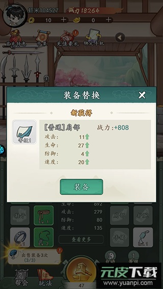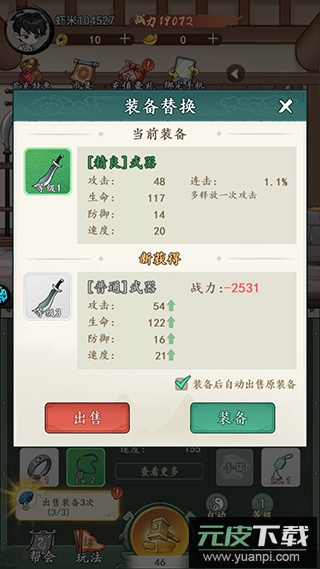 2、获得更高品质的装备后,可以快速替换上身,同时将旧装备出售换取资源;