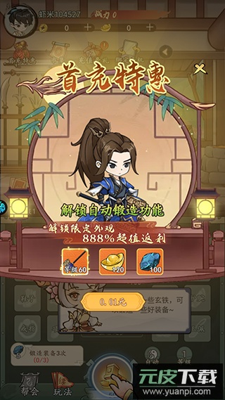 4、游戏首次充值仅需一分钱,便能领取大量奖励并开启自动锻造功能;