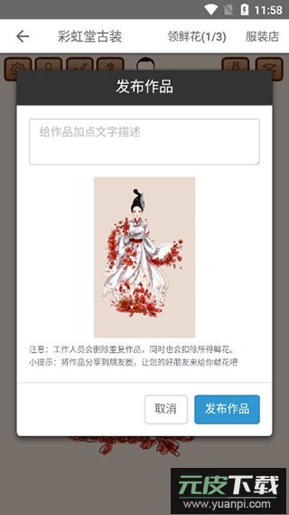 7、完成造型后点击左上角确认按钮发布作品,并可附上文字说明。