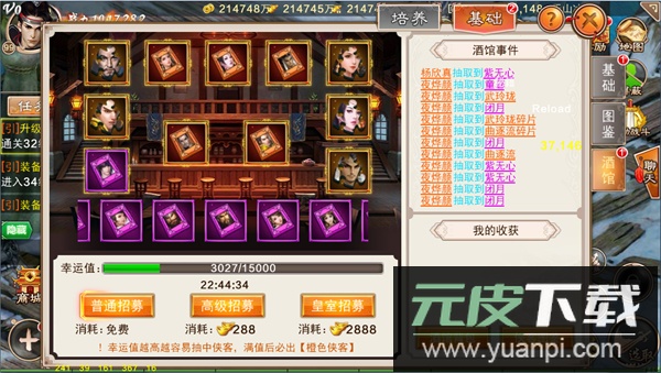 获取侠客的主要方式为酒馆招募,每次招募都会积累幸运值,幸运值满时便有绝顶高手现身。