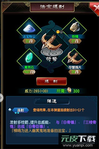 在此界面能够查看炼制必备的材料,同时会显示可与之进行灵化组合的其他宝物;点击材料图标能查询具体获取途径;部分宝物与强化材料也可通过开启玄天宝箱获得。