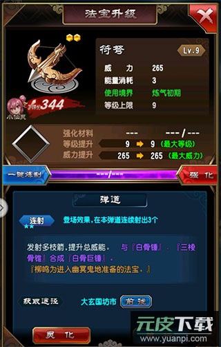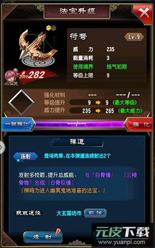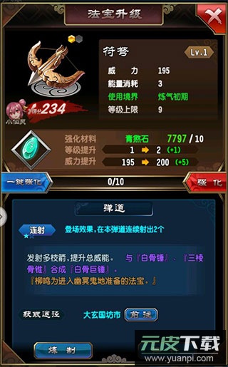 以符弩为例,提升法宝需经历两个阶段:先进行升级,随后开展炼制;升级主要通过宝物强化实现。