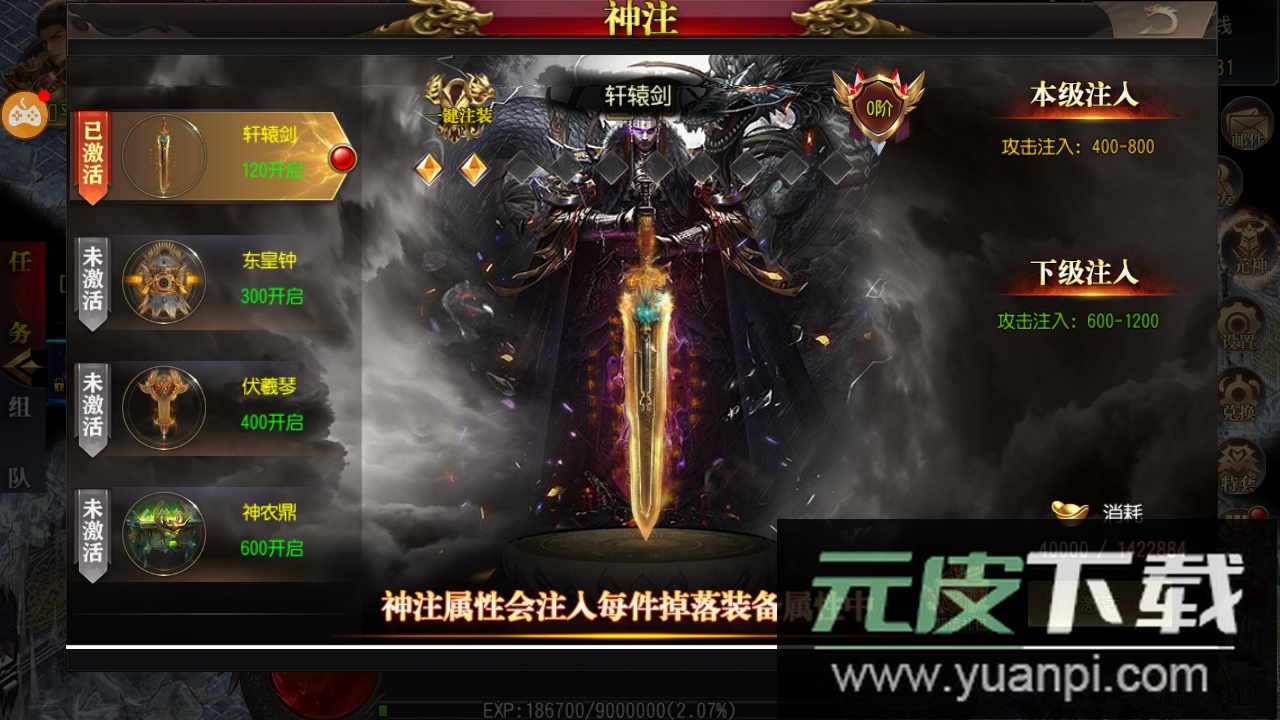 2. 共包含七大神注:轩辕剑提升攻击、东皇钟强化防御、伏羲琴增加魔攻、神农顶提高魔防、女娲石补充血量、昊天塔提升暴击、盘古斧增强神圣属性;