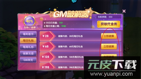 2. 选择充值功能,点击“立即破解”选项;此操作需消耗通过击败boss获得的余额。