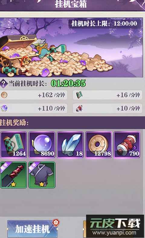 4、挂机宝箱:通过挂机玩法有概率获得装备,已通关的关卡层数越高,掉落高品质装备的几率也随之增加;使用加速挂机功能同样有机会获取。