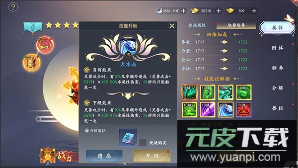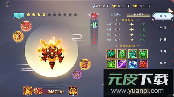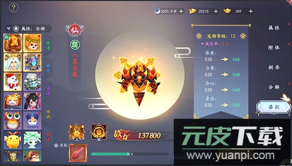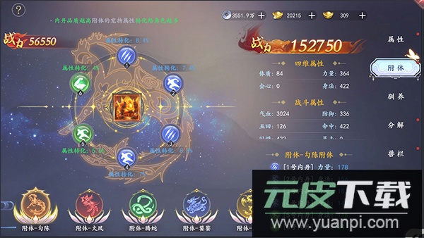 2、附体系统:宠物可上阵至特定阵法,通过阵眼将部分属性转化给角色,宠物数量越多,该系统的收益越明显;