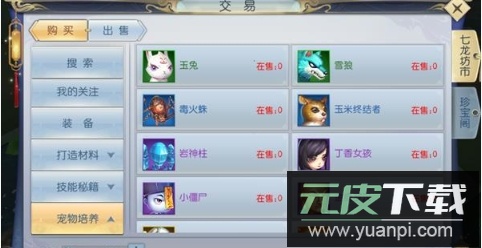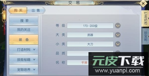在七龙坊市中,玩家可通过搜索名称快速定位所需道具,可交易物品包括装备、材料、宠物、妖灵及其他稀有资源,购买需消耗银锭;