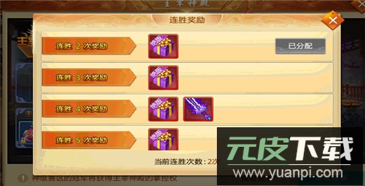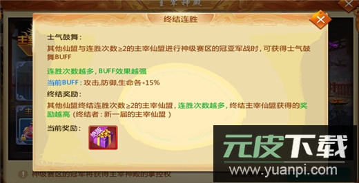 为避免出现单一仙盟长期垄断的局面,当神级赛区决赛对阵方为连胜多次的主宰神殿仙盟时,其对手将获得一定程度的属性增益;且神殿仙盟的连胜次数越多,对手获得的增益效果也越强。
