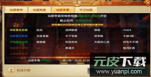 仙盟争霸是检验团队协作能力的重要活动,于服务器开启第四天及此后每周日举行。首次争霸将根据仙盟总战力进行分级,共设神、仙、天、地、人五个赛区,每个赛区容纳四个仙盟。其中,人级赛区由除去前四级赛区后战力排名最高的四个仙盟组成。