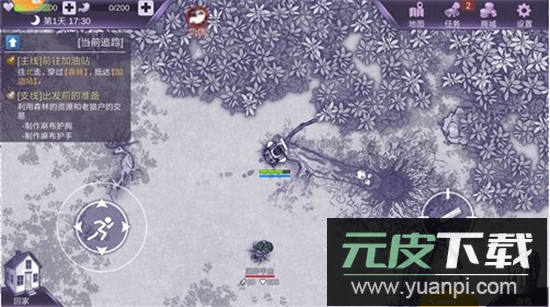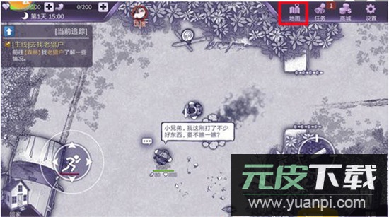 2、进入森林后可与老猎人对话领取任务,但建议先不前往加油站,因早期战力不足。打开右上角地图可查看森林全貌。