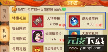 商城-礼包-特惠礼包新增逆天资质丹,售价三十元。使用条件为:天伤之魂十级、吞噬满级、资质进阶七十次,且仅限初始资质两千以上的宠物。满足条件的宠物使用后资质可提升至九千五百,齐天大圣可达九千八百。