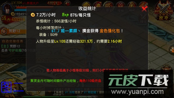 收益计算公式可参考:怪物数量×波数×单怪经验×时间。例如图示中,3只怪×566波×876经验×2.16小时,约获得321万经验。
