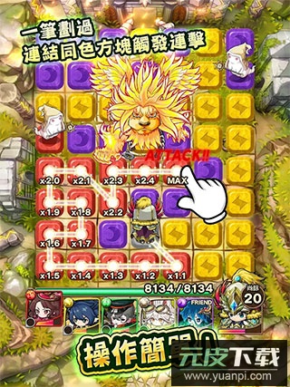 方块颜色对应火雷水木四种属性宠物;按路线属性召唤相应宠物协同攻击,同时积累怒气释放技能;纯色队爆发力强但易受格子限制,多色队输出更平稳。