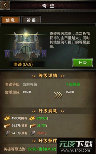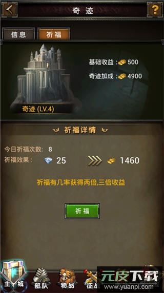 奇迹系统的核心功能是产出金币,同时也是升级其他建筑的前提条件。当英雄等级达到12级后,此功能便会开启。该系统主要分为信息介绍与祈福两个部分。