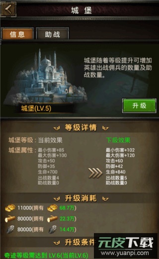 当英雄等级提升到一定阶段,城堡功能便会开放。此系统包含信息介绍与助阵系统两大模块,是强化英雄属性的重要途径。城堡等级提升后,英雄的伤害、攻击、防御、生命及出战单位数量都会得到增强。