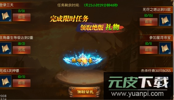 3、完成限时任务,开服后将出现一系列限时任务;每完成一项即可得到一张藏宝图,若在规定时间内全部完成,还有荣誉头衔与幻武等重磅奖励。