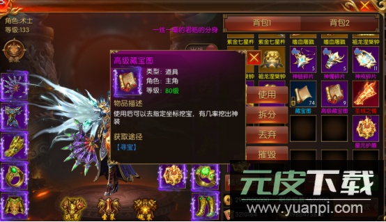 1、藏宝图分为普通与高级两种,点击使用后,跟随指南针指引前往指定地点挖掘,便有机会找到神装。