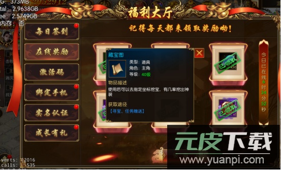 1、通过在线奖励获取,在福利大厅界面中,停留时间越长,得到的奖励越丰厚,其中就包含藏宝图与其他稀有材料。