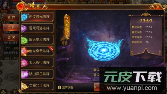 装备法阵无需直接消耗货币,只需角色等级满足要求并持有对应货币即可。每种法阵均能显著提升攻击力与对战防御,有效减少所受伤害。