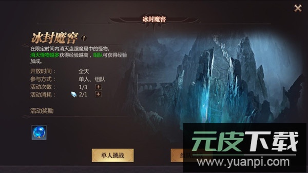 2、每日成功挑战可获得活跃度20点;进入前需确认剩余挑战次数并准备门票“寒冰之心”;挑战次数可购买增加,门票可通过魔石商店、绑魔商店直接获取,亦可在日活跃度达到108时领取,或从其他活动中获得。