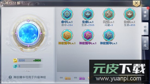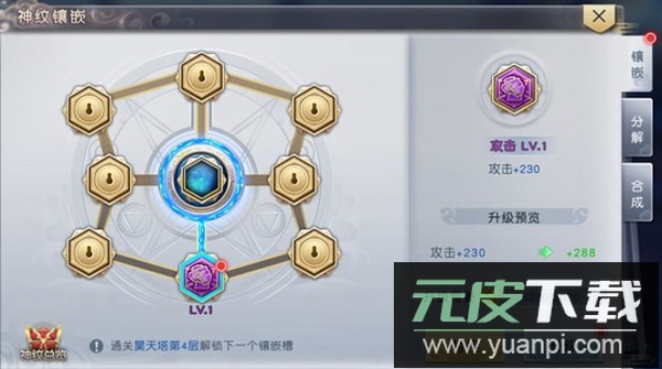 3、玩家可使用神纹精华对已镶嵌的神纹进行强化,以此获得更多属性加成;精华可通过挑战通天塔或分解冗余神纹获取。