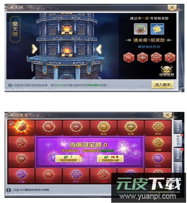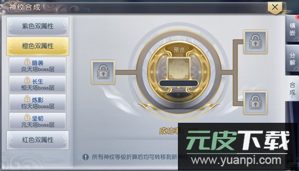 5、当通天塔突破至特定层数,将解锁双属性神纹合成配方;依据配方可将两枚不同属性的神纹融合为一枚双属性神纹;合成后的神纹兼具两种属性特长,且每条属性的加成数值均优于原单独神纹。