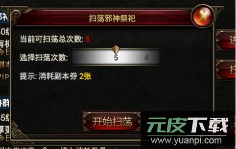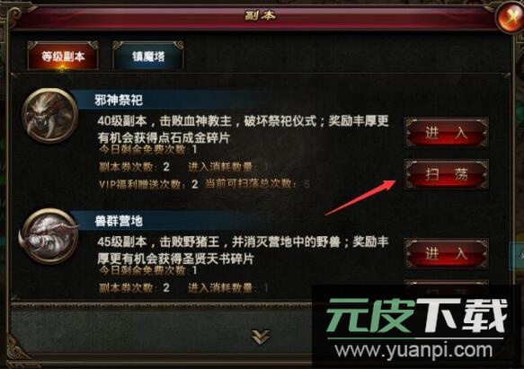 如图,副本界面设有【扫荡】功能,玩家可选定次数,点击后自动完成副本并领取奖励。请注意提前清理背包空间,否则无法扫荡。