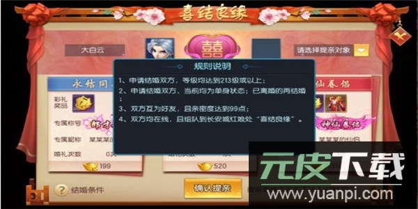 游戏中达到213级的单身异性玩家,双方好友亲密度满99后,可在主城红娘处提亲结缘。