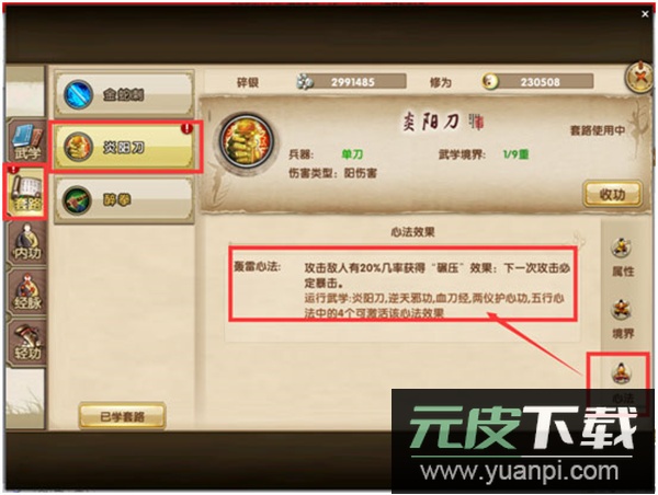 每种武学搭配特定内功可激活专属心法效果;玩家可在套路界面查看心法详情与激活条件。