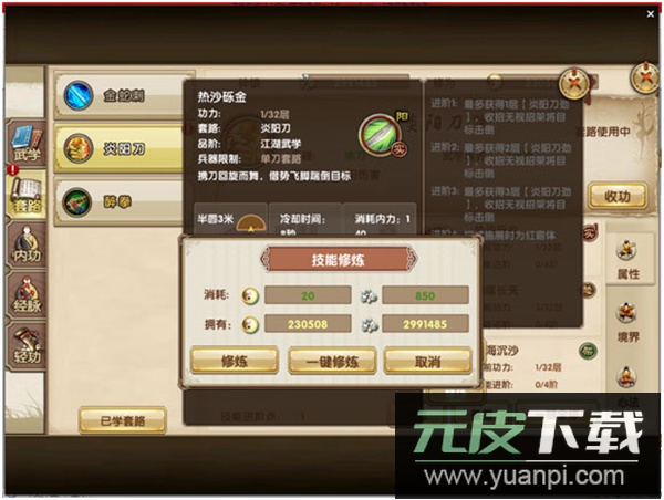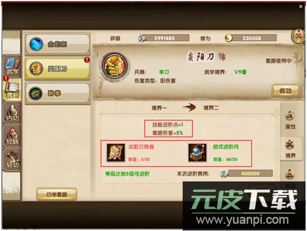 提升套路境界需要碎银、招式进阶丹及对应武学残卷;境界突破后不仅增加进阶点,还能提高招式伤害。