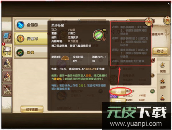 部分武学技能可进行进阶,通过消耗进阶点数来强化伤害与特效;进阶点数来源于套路境界的提升。