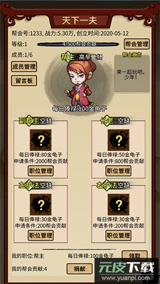 在此申请帮会职位,除帮主外设有四个职位,任职后可每日领取金龟俸禄;