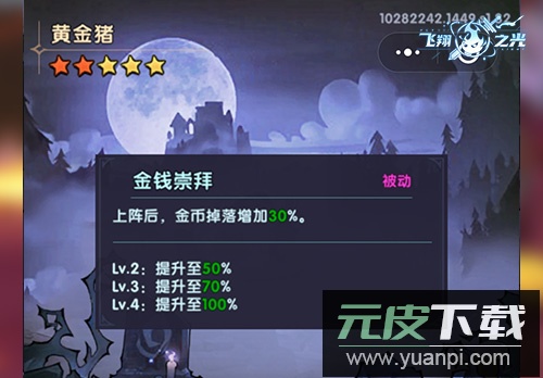 黄金猪属于英雄级宠物,召唤获取较为容易;玩家也可通过游戏前期的孵蛋活动获得。它提供的属性加成虽不突出,却拥有稀有的上阵技能——金钱崇拜。将该技能升至满级50级,可使金币掉落提升100%。