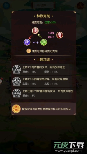 一套有效的阵容策略是“三一三组合”:即上场三名同阵营伙伴、一名佛魔阵营伙伴、三名不同阵营伙伴,能为全体伙伴带来属性加成。这种组合在前期尤其利于推进关卡。