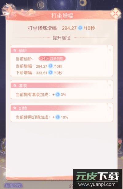领取效率可通过仙阶、套装及幻境三种方式提升,当前修为增益可在增幅详情页面查看。