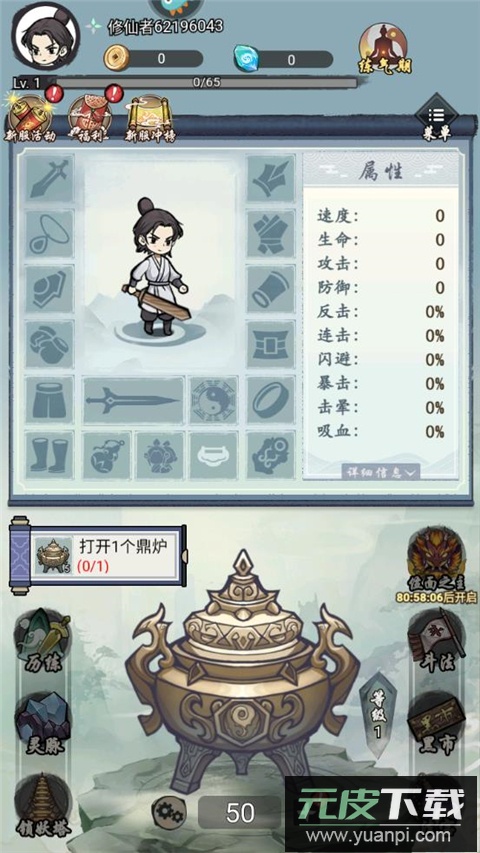 这款游戏融合了国风水墨风格与修仙题材,采用放置玩法设计,对新手十分友好。开局玩家将获得一尊鼎炉,通过开启和更换装备、提升鼎炉等级与角色属性,能够在斗法竞技中逐步成长。装备属性若不合心意,可一键出售以保持背包整洁。游戏整体操作简便,难度设置合理,易于上手。