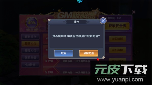 2.选择充值功能,点击立即破解按钮,注意需消耗游戏内通过击败首领获得的余额;