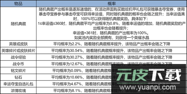 抽中随机典藏奖励时,将从以上物品中随机产出一款,所有奖励获取概率均等。