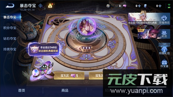 玩家参与暴击夺宝时,每次抽取均有机会额外获得更多幸运值。当暴击夺宝幸运值累计达到360点后,下一次抽取必定获得随机典藏奖励。