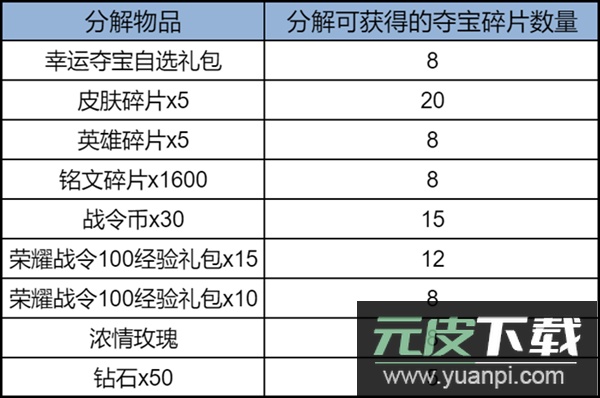 7. 分解规则:在夺宝盒中选中需要分解的奖励,点击分解即可将其转化为夺宝碎片。具体分解比例如下: