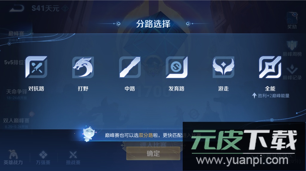 巅峰赛分路选择升级为【自由分路模式】,玩家可自主选择主玩分路或主次分路进入匹配。