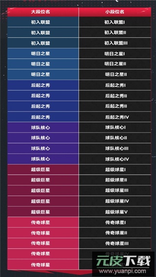 排位机制方面,天梯赛季设有七个主要段位:初入联盟、明日之星、后起之秀、球队核心、超级巨星、传奇球星及名人堂。除名人堂外,其他段位均细分多个小等级,例如明日之星I、II、III等。名人堂段位不再区分小级,而是通过累积星数进行排名。