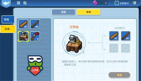 接下来需要制作工具,打开背包进入合成栏,选择常用项目。初期可合成木板、木棒、工作台和火把,先制作一个工作台。