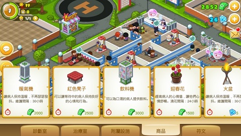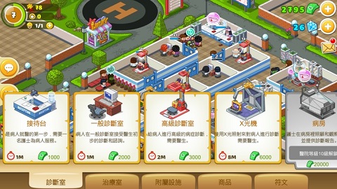 3、医院右侧的建筑可用于科技研发与经验分配。积累的经验能为医护人员升级,提升工作效率。资金充裕时应考虑聘用综合能力更强的职员。点击已建造的诊室可进行换装、移位或升级操作,升级能提高诊费并增强医疗水平。