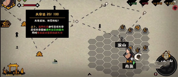 占卜是影响天命的重要手段。商周时期,王室常通过灼烧龟甲观察裂纹以询问天意。游戏中,当目标国家处于友善状态时,若强行征伐需进行占卜;若得吉兆,出征可增加天命,若得凶兆则会减少。若目标国家处于交恶状态,出兵将直接提升天命。因此,在统一过程中需密切关注天命变化,灵活运用占卜引导局势。某些特定事项的占卜还可能直接招揽强力的名臣助阵。