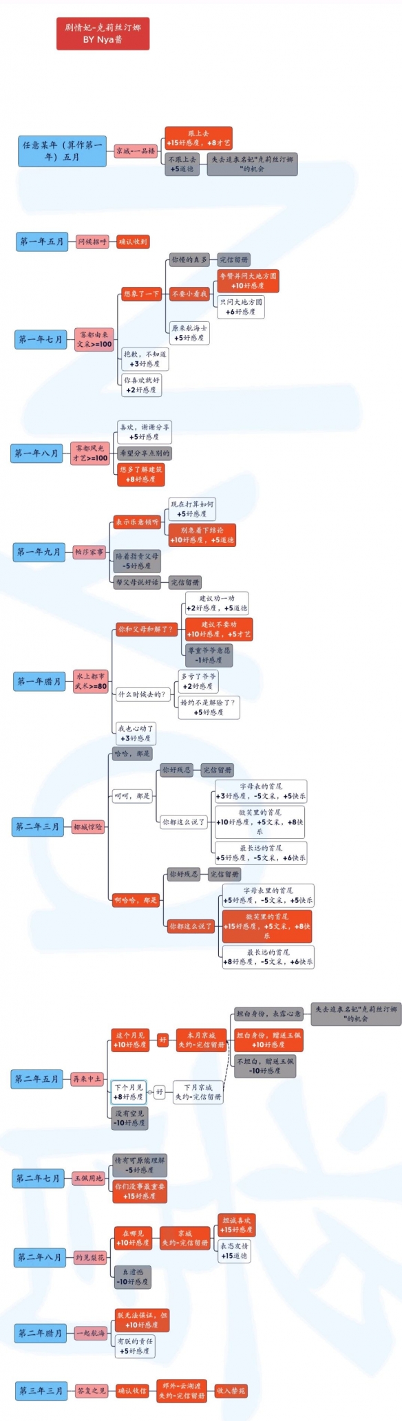 时间与选择如下:需满足文学100、才艺100、武术80的属性要求,可从任意一年五月开始,注意错过任何约会都会导致攻略失败。