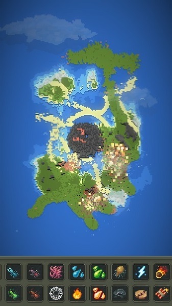 2、游戏支持模拟各类自然灾害,陨石、火山、熔岩、龙卷风、喷泉都能自由生成,你可以尝试用不同元素组合出不一样的玩法,用酸雨腐蚀地表,投放核弹或者召唤龙卷风,还能调用地下蠕虫、灼热射线,不管是享受创造与破坏的爽感,还是搭建充满生机的文明世界都能实现;
