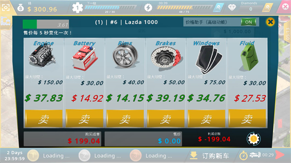 5、在库房中可以出售引擎、轮胎、电池等主要零件,这些零件的价格每五秒波动一次,建议在价格高点时卖出以获取最大收益。