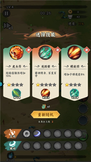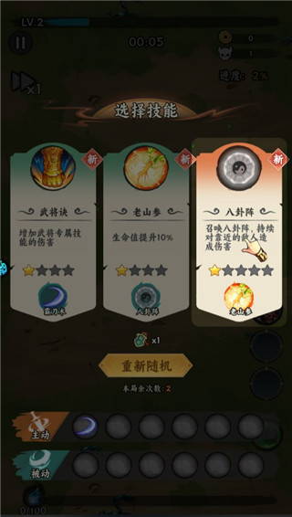 3、进入关卡后先进行技能选择,优先选八卦阵,能实现低损耗甚至无伤刷怪;